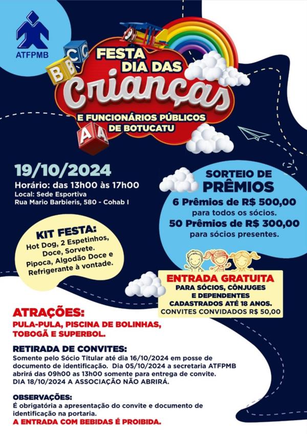 Autor: - 21/10/2024A equipe ATFPMB gostaria de agradecer a presença de todos os sócios e familiares na nossa FESTA DIA DAS CRIANÇAS E DOS FUNCIONÁRIOS PÚBLICOS 2024.